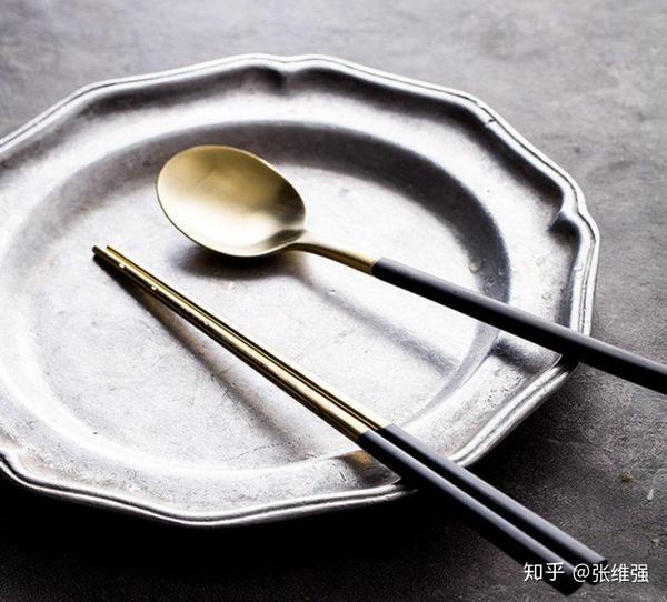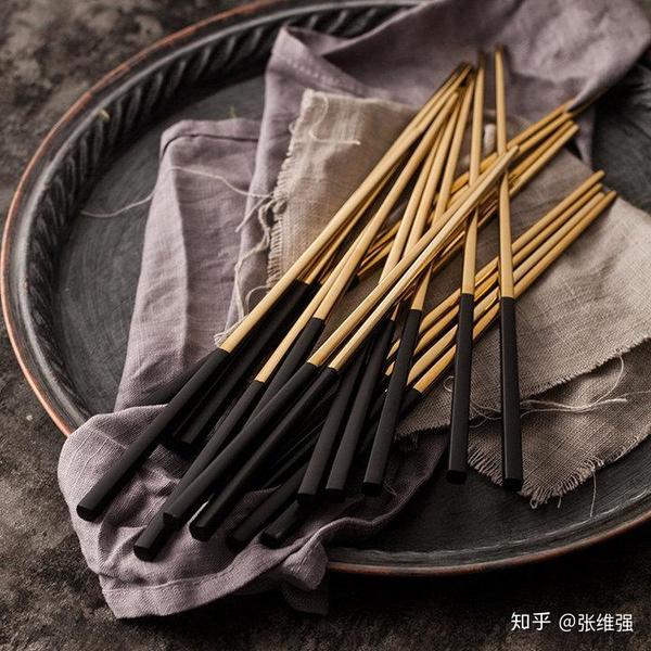 黑色和金色的搭配特别显眼,中式餐具搭配出西式餐具的西洋感,格外适合喜欢奢华感的同学,不过最好选择深色的盘子与之搭配,才好衬托出筷子的金属感。