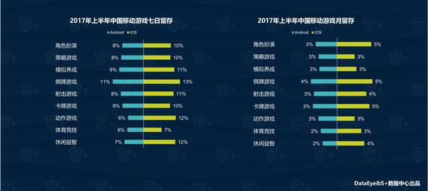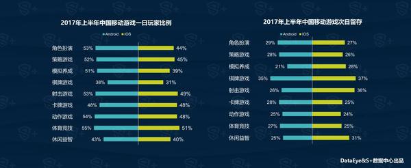 2017年上半年,棋牌、卡牌、角色扮演类及策略游戏有较高的次日留存。